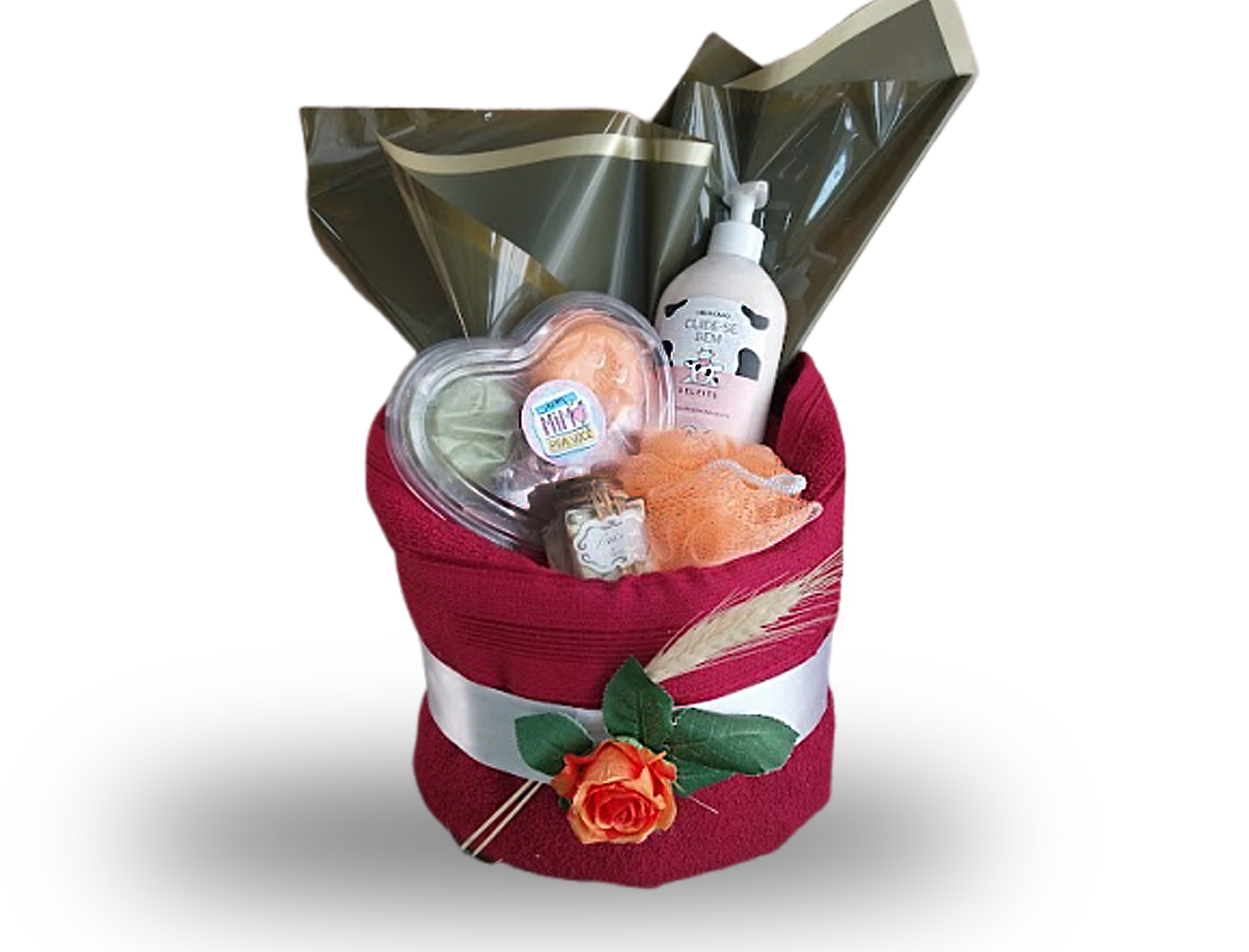 Elegante cesta de banho com produtos de qualidade, adornada com fitas de cetim, contendo: