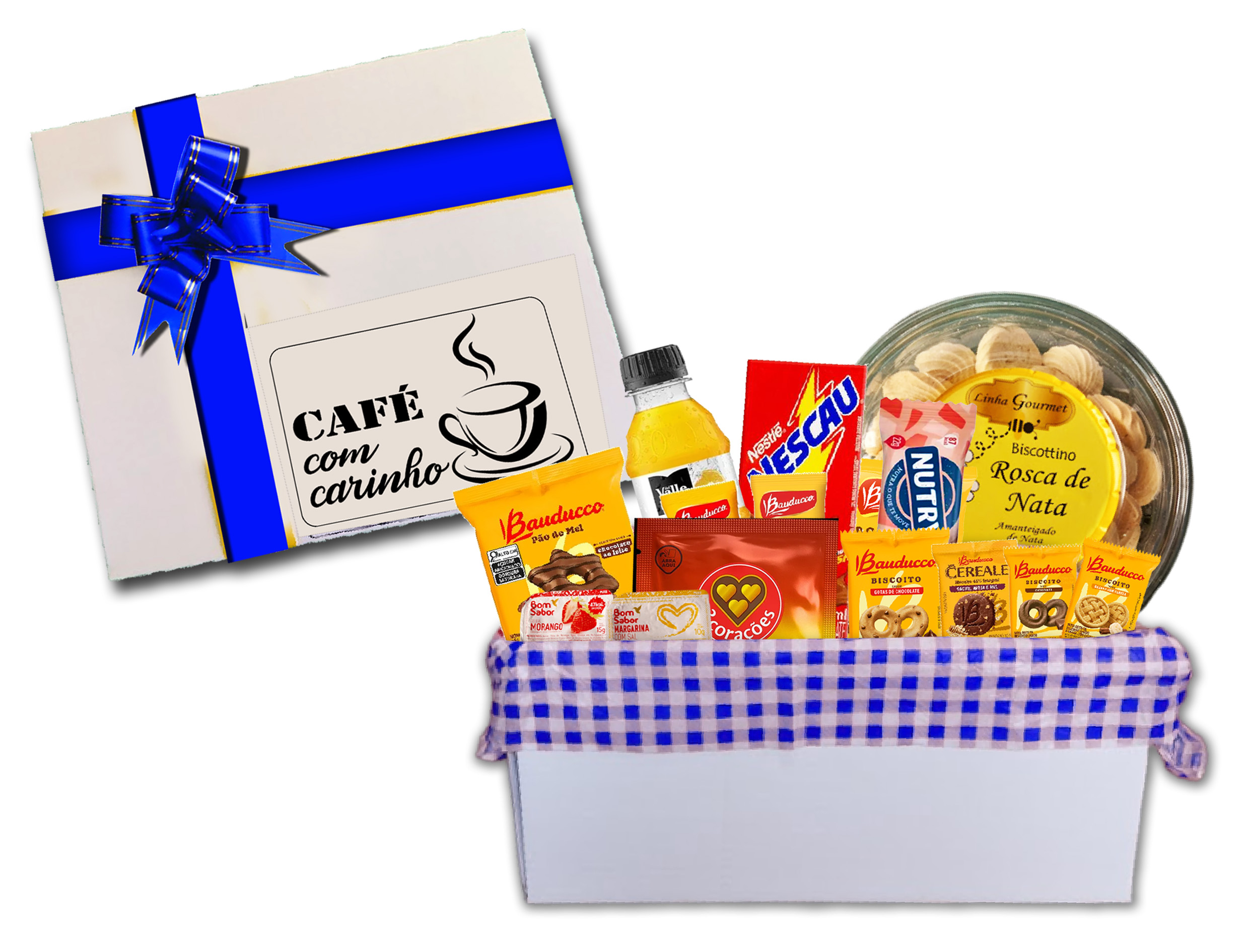 Deliciosas gostosuras, com produtos de qualidade, para um café da manhã ou mesmo chá da tarde, embalada em uma caixa de papelão branco com tampa decorada com fitas e laço contendo: